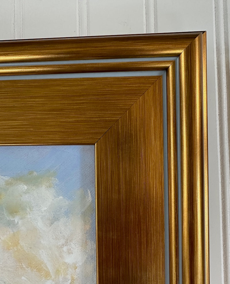 Frame is a plein air gold. Framed size is 13"W x 13"H.